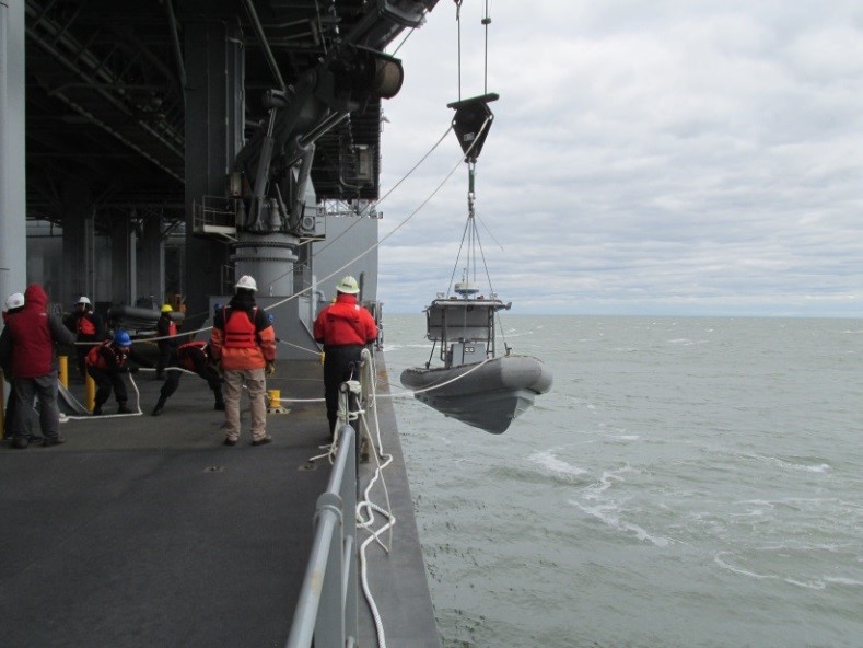 Figure 4: The crew of the USNS Lewis B. Puller (T-ESB 3) demonstrates launch and recovery of an 11m Rigid Hull Inflatable Boat. The ships Military Crew provides Material Handling Equipment operators to maneuver the craft on the T-ESB 3 mission deck and line handlers to control the boat while being maneuvered by the ship’s mission deck crane. Military Sealift Command provides Civilian Mariner crane operators and deck safety officer for this evolution. |