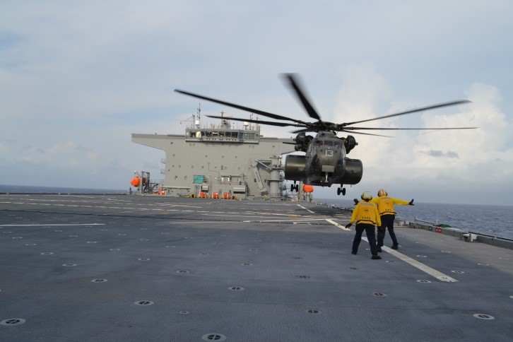 Figure 6: Dynamic Interface testing is conducted to evaluate the USNS Lewis B. Puller (T-ESB 3) ship aviation facilities in support of an Aviation Certification for day and night launch and recovery operations, aircraft servicing and hangaring. Additional purposes of DI are to establish and expand operational envelopes for the MH-53E, conduct a Vertical Replenishment demonstration in support of operational requirements and certify flight deck crew qualifications.