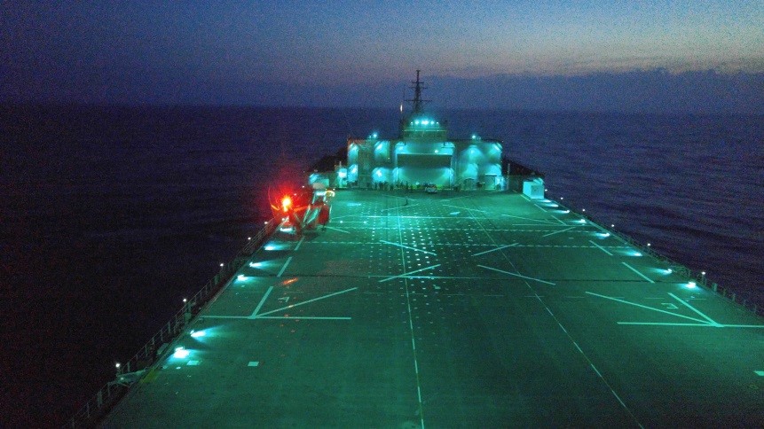 The ship has an aviation hangar and flight deck that includes four operating spots capable of landing MH-53E equivalent helicopters, as well as accommodations, work spaces, and ordnance storage for embarked force, enhanced command, control, communications, computers, and intelligence capabilities to support embarked force mission planning and execution, and reconfigurable mission deck area to store embarked force equipment to include mine sleds, rigid hull inflatable boats, and the Combatant Craft Assault.