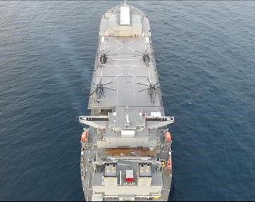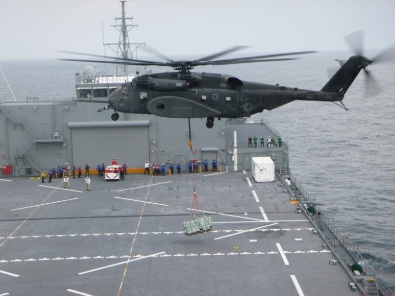 Figure 7: USNS Lewis B. Puller (T-ESB 3) demonstrates the Vertical Replenishment with two aircraft: MH-53E and MH-60S. The full Vertical Replenishment evolution consists of an approach, a hover over the designated area for a load hookup, a departure into one lap around the pattern with the load attached, a hover over the designated area for load drop-off and a departure. Tanks filled with sea water simulated actual loads.